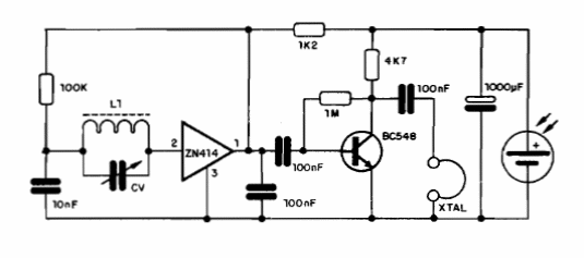 El circuito integrado ZN414 utilizado en este proyecto, no es muy fácil de obtener, ya que su producción ha sido descontinuada. Sin embargo, si el lector tiene la posibilidad de conseguir uno, este proyecto muestra cómo usarlo en una radio AM de muy bajo consumo que puede ser alimentado por células solares u otras fuentes alternativas de energía de 1,2 V a 2,0 V normalmente. L1 consiste en 80 espiras de hilo esmaltado 28 a 30 AWG en un bastón de ferrita de 1 cm de diámetro y de 12 a 20 cm de longitud. CV es capacitor variable aprovechado de una vieja radio de ondas medias. El auricular debe ser obligatorio de cristal (alta impedancia).