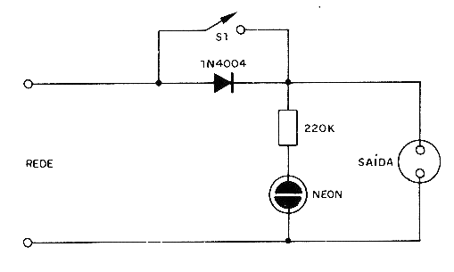 Con el circuito indicado se puede dejar un soldador medio calentado, o en una posición de baja potencia, lo que ocurre cuando S1 está abierta y sólo la mitad de los semiciclos de la alimentación son conducidos. Con el diodo utilizado el circuito admite soldadores hasta 100 W. No utilice este circuito con aparatos electrónicos o lámparas electrónicas. Atención, pues el circuito no tiene aislamiento de la red de energía.