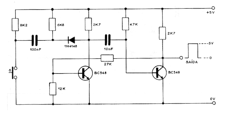 Al presionar S este circuito genera un pulso único de duración constante determinada por el capacitor de 10 nF y por el resistor de 47 k. Los valores de estos componentes se pueden cambiar. La salida tiene 5 V de amplitud y es compatible con la tecnología TTL. El circuito sirve como un interruptor libre de repique para sistemas de accionamiento manual. La alimentación debe realizarse con tensión de 5 V.