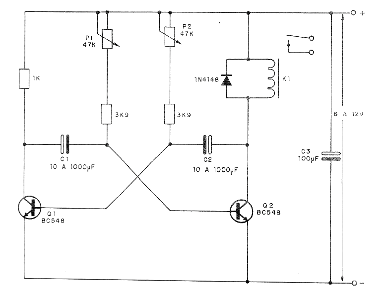 El ciclo activo de este relé se ajusta en P1 y P2 y para diferentes bandas de tiempos, C1 y C2 se pueden cambiar en el rango de valores indicado en el diagrama. El circuito funciona con tensiones de 6 a 12 V y se utilizan relés correspondientes con corriente máxima de accionamiento de 50 mA. Los posibles cambios en los valores de algunos resistores pueden ser necesarios para adaptar el circuito a las características del relé utilizado.