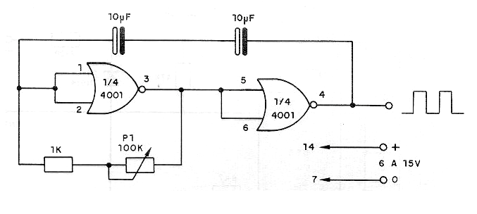 Este oscilador puede generar señales de frecuencias que van de 0,01 Hz a 100 Hz, dependiendo sólo del valor de los capacitores y del ajuste de P1. La señal es rectangular y la alimentación se puede hacer con tensiones de 6 a 15 V. Los demás integrados que se pueden conectar como inversores, como el 4011, se pueden utilizar en este circuito.