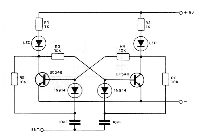Los pulsos negativos aplicados a la entrada hacen que este flip-flop cambie de estado, lo que será indicado por los LEDs conectados a los colectores de los transistores. Para el disparo por tacto se puede utilizar un transistor común resistor de 10 k en el colector y una resistencia de 1M en la base, conectada a un sensor. El circuito tiene bajo consumo y puede ser alimentado por pilas. Finalmente, en caso de disparo errático o falta de sensibilidad, los valores de los resistores de 10 k se pueden cambiar en el rango de 4k7 a 47 k ohms.
