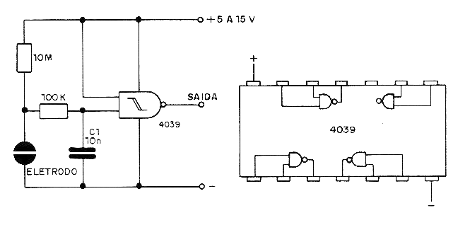 Un toque en el sensor de este circuito, que consiste en dos planchas cercanas, hace que la salida del circuito cambie de nivel. El capacitor tiene por función evitar el repique y su valor puede ser alterado, y caso de necesidad. El circuito no debe ser alimentado por fuente sin transformador. Las otras puertas del 4093 se pueden utilizar para otros propósitos, ya que son independientes. El resistor de 10 M determina la sensibilidad al tacto y puede cambiarse. No utilice cables largos hasta el sensor.