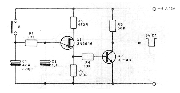 Si bien los transistores unijuntura cuasi no se utilizan actualmente, este circuito es interesante e incluso tiene fines prácticos en juegos como, por ejemplo, una ruleta electrónica. Cuando presionamos S y luego suelta la descarga del condensador C1 por el transistor unijunción genera un número aleatorio de pulsos que pueden excitar un contador CMOS u otro circuito. El número es aleatorio, pues la descarga del capacitor está condicionada también a su tiempo de descarga y al tiempo en que S es presionado. El circuito puede ser alimentado con tensiones de 6 a 12 V y tiene un consumo bastante bajo.