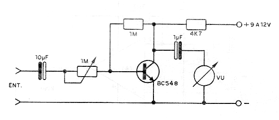 Este VU-meter analógico o Volume Units Meter, medidor de unidades de volumen, emplea un instrumento de bobina móvil que hasta puede ser obtenido de viejos amplificadores de audio. Conectado a la salida del altavoz de un aparato de sonido, indica las variaciones de la intensidad del sonido reproducido. El instrumento puede ser un microamperímetro de 200 uA a 1 mA de fondo de escala y la alimentación puede ser externa, o retirarse del propio aparato con el que va a funcionar.