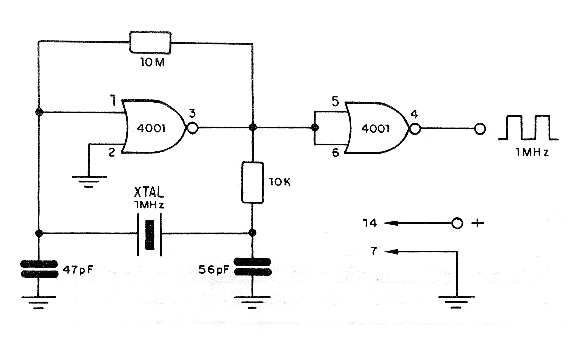 Este circuito genera una señal rectangular de 1 MHz, determinada por el cristal. La alimentación debe realizarse con tensiones de 5 a 12 V y el cristal puede tener otras frecuencias dentro de la capacidad de operación del circuito integrado. Los capacitores deben ser cerámicos.