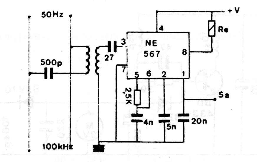 Este circuito se basa en el conocido PLL 567 que puede operar a 100 kHz. El transformador se puede enrollar en un bastón de ferrita con 100 espiras en cada devanado de hilo 28 a 32. La alimentación va de 5 a 10 V.