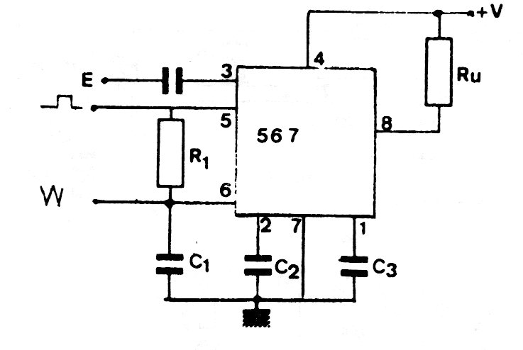 Este circuito con el PLL567 sirve como decodificador para señales moduladas PWM de frecuencias hasta unos 500 kHz. R1 y C1 determinan la frecuencia y C2 y C3 pueden ser de 10 nF a 100 nF según la aplicación. La alimentación debe realizarse con tensiones de 5 a 10 V.