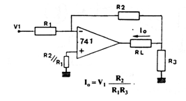 En la figura tenemos una fuente de corriente cuya intensidad es dada por la fórmula junto al diagrama. La intensidad máxima depende de la salida del 741 y del orden de 50 mA. La fuente de alimentación debe ser simétrica.