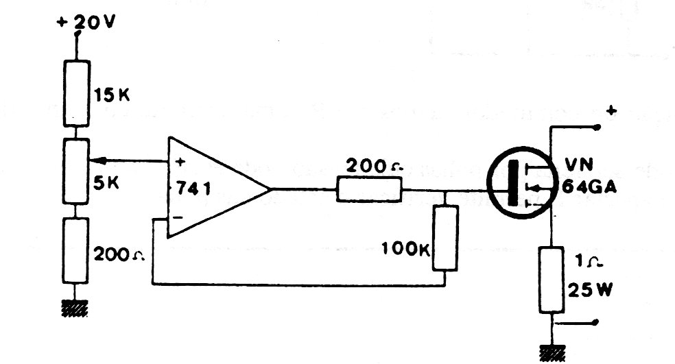 Este circuito de alta corriente utilizando un MOSFET y un operacional se encontró en una documentación de los años 80. El potenciómetro ajusta la corriente para una carga de hasta 25 W. El MOSFET admite equivalentes debiendo ser dotado de disipador de calor.
