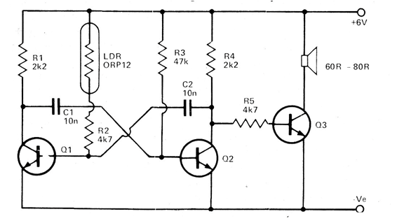Esta configuración tradicional de multivibrador utiliza un LDR como sensor. El circuito emite sonido cuando recibe luz. Los transistores Q1 y Q2 pueden ser BC548 y Q3 puede ser un BD135 o TIP31. La alimentación, en realidad, se puede hacer con tensiones entre 6 y 12 V.