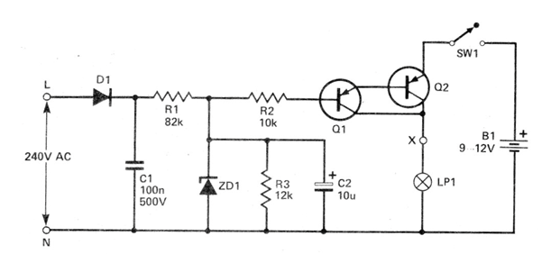 Cuando falta tensión en la red de energía, el circuito hace que una lámpara se encienda. El circuito puede ser modificado para accionar un LED de alto brillo con un resistor de 100 ohms en serie y aún R1 puede ser cambiado para operación en la red de 110 V. Q1 puede ser un BC558 y Q2 un BD136 o TIP32, conforme la corriente de la corriente lámpara. ZD1 es un zener de 12 V.