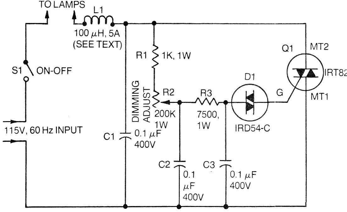Esta es una versión de dimmer para lámparas incandescentes (no utilice otro tipo) de una antigua documentación de International Rectíficier (IR), fabricante del triac y del día. El circuito puede ser montado con triacs de la serie TIC y cualquier diac. También podemos hacer cambios para operar en 220 V aumentando C2 y C3 a 220 nF; El triac debe estar dotado de radiador de calor y L1 consiste en 10 espiras de hilo 16 en un tubo de 1 cm de diámetro.