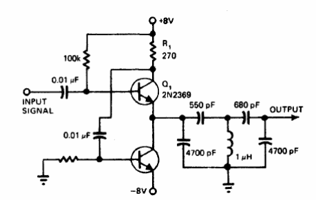 Este circuito de una antigua publicación americana utiliza transistores de RF para obtener una ganancia unitaria de tensión, pero con alta impedancia de entrada y baja impedancia de salida. La resistencia de base del segundo transistor, que no tiene valor en el diagrama, puede ser de 10k. Los transistores pueden ser los 2N2222 para frecuencias de hasta 100 MHz.
