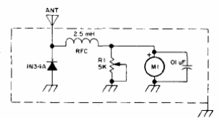 Este circuito, que opera con frecuencia de hasta algunas decenas de megaciclos, es de una publicación de 1976. La antena es telescópica y el potenciómetro de ajuste puede ser de 4k7. El instrumento puede tener fondos de escala de 200 uA o 1 mA.