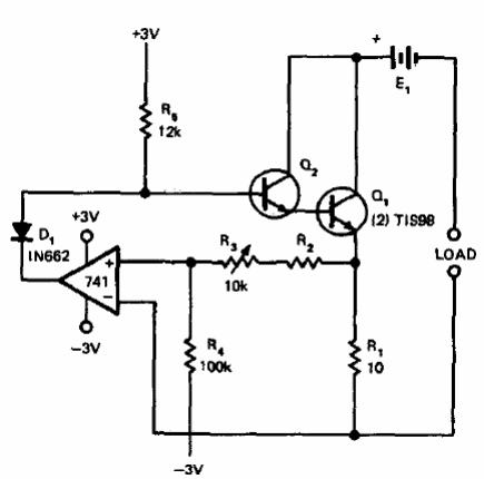 Esta fuente de corriente constante fue obtenida en una documentación americana de 1973. Los transistores pueden ser los BC548 y la corriente tiene su intensidad ajustada en R3. El diodo D1 puede ser un 1N4148 y el circuito se puede cambiar para operar con otras tensiones. La fuente de alimentación debe ser simétrica.