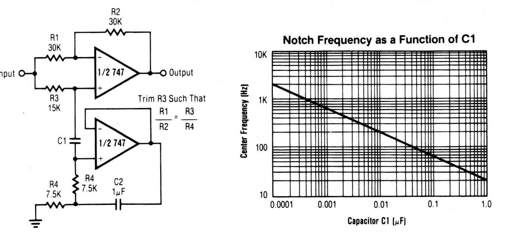 El 747 es un amplificador operacional antiguo, pero la configuración vale para los operacionales modernos. En este circuito el 747 funciona como un girador y en el gráfico al lado del diagrama tenemos las características el circuito en función del capacitor usado.