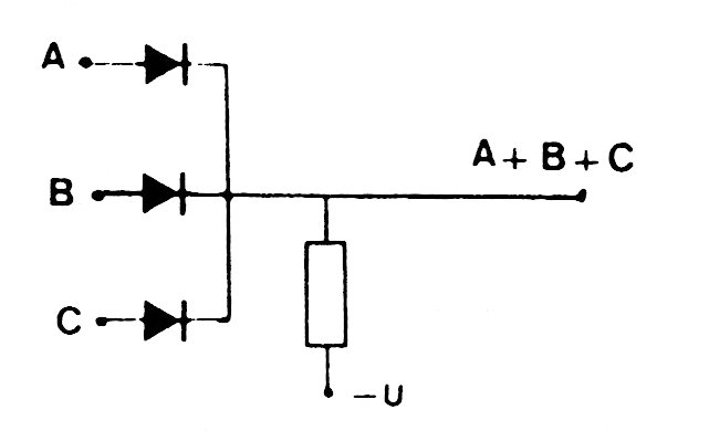 En la figura tenemos el modo de implementar una función lógica O o OR de 3 entradas usando diodos comunes. El circuito puede tener otros números de puertas.