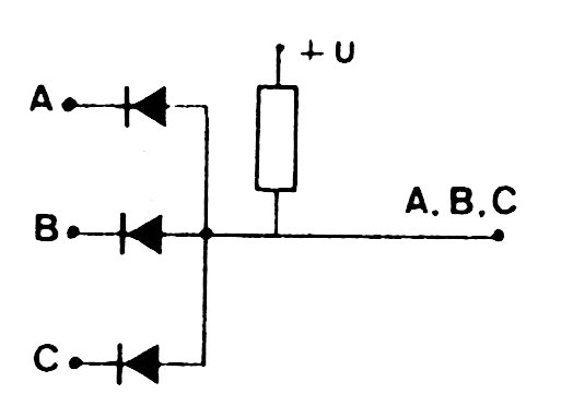 Una puerta Y o AND puede elaborarse sobre la base de diodos comunes. En el caso de los diodos son de uso general y la puerta tiene tres entradas. La tensión de alimentación depende de la aplicación.