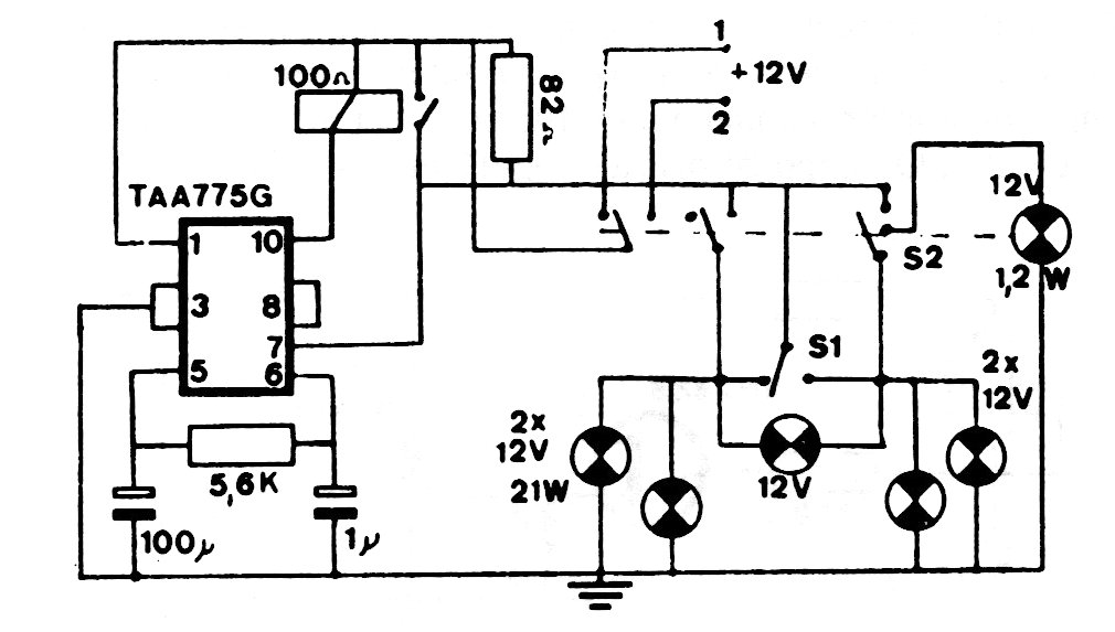 Este circuito está indicado para aplicaciones automotrices de señalización. El circuito integrado no es común actualmente. El circuito es de una documentación de los años 80.
