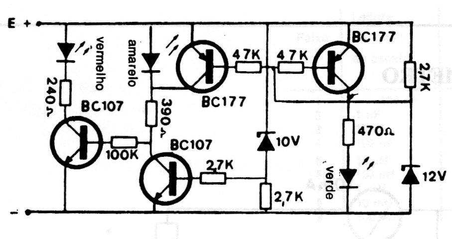 El circuito mostrado indica tensiones de 10 a 14 V sirviendo para monitorear tensión automotriz. Uno o dos LED se encienden según la tensión. Los transistores admiten equivalentes modernos.