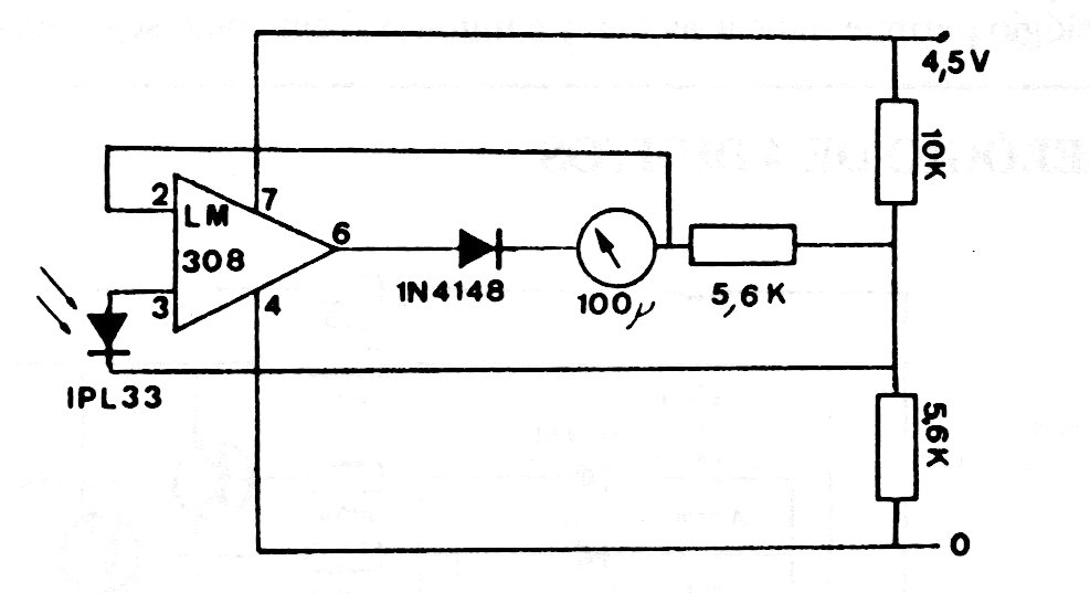 El sensor de este circuito es un foto-diodo. Se pueden utilizar operacionales equivalentes y el instrumento puede ser sustituido por la escala más baja de las corrientes de un multímetro común.