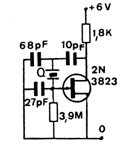 Esta configuración alcanza algunas decenas de megahertz dependiendo del cristal y del FET. Los capacitores deben ser cerámicos. El FET admite equivalentes.