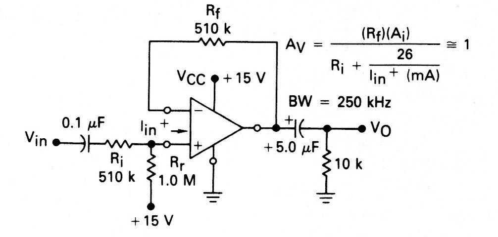 Este circuito es del propio manual del componente, pero se aplica a otros de la misma familia. El circuito tiene alimentación de 15 V, pero funcionará con equivalentes de menor tensión en aplicaciones apropiadas.