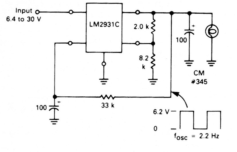 Este circuito utiliza el LM2931 que no es un componente común actualmente. Lo que hace es accionar una lámpara haciéndola parpadear en frecuencia determinada por el condensador. La configuración se puede implementar con reguladores equivalentes.