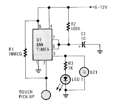 Este circuito fue encontrado en una edición de 1987 de la revista Hands On Electronics de Estados Unidos. La revista ya no existe, pero el circuito puede ser montado con facilidad, pues los componentes son comunes. El circuito tiene una acción temporizada quedando el LED encendido y el buzzer tocando por un tiempo determinado por C1 y por R2. Nunca utilice fuente sin transformador en este circuito.