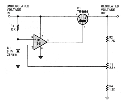 El circuito presentado fue encontrado en un Hands On Electronics (USA) de 1987. La revista ya no existe, pero el circuito se puede montar fácilmente. El transistor debe estar dotado de disipador y la tensión de salida es determinada por el zener. La tensión de entrada debe quedar al menos 3 V por encima de la que se desea obtener en la salida y la corriente máxima es del orden de 3 A.