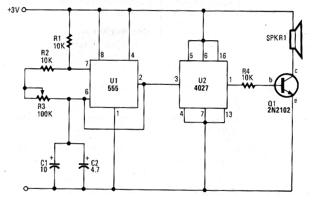 He encontrado este circuito de metrónomo en una Hands-On Electronics de 1986. Esta revista americana ya no existe, pero el circuito es totalmente viable por los componentes que usa. El circuito se alimenta con 3 V, pero si cambiamos el transistor por un BD135 con disipador, el circuito puede funcionar con tensiones de 6 V a 12 V. El altavoz es de 4 ohms y 8 ohms.