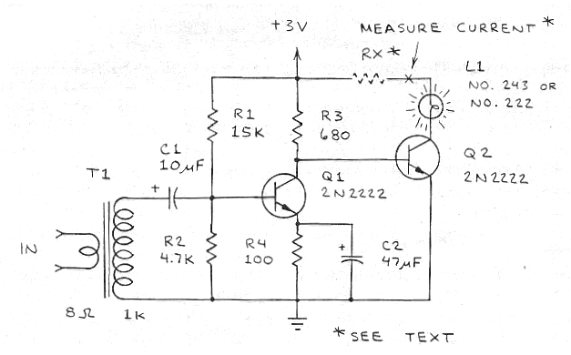 He encontrado en una revista de 1990, que ya no existe, la Modern Electronics de los Estados Unidos. Se trata de un modulador para un intercomunicador óptico. La señal se amplifica excitando una lámpara incandescente de 3 V; El circuito también debe funcionar con lámparas de 6 V. Recordamos que la respuesta de frecuencia de este circuito está limitada a poco más de 1 kHz, limitándose a las comunicaciones de voz. La señal viene de un pequeño amplificador de audio. Para lámparas de 100 a 200 mA utilice un BD135 para Q2.
