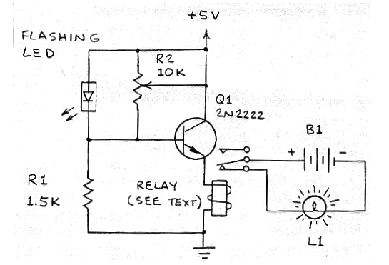 La idea básica de este circuito que encontré en una revista de 1990, que ya no existe, la Modern Electronics de los Estados Unidos, es aprovechar un LED parpadeante para controlar un relé que hace parpadear una lámpara más grande. El circuito es alimentado por 5 V, y el relé debe ser del tipo sensible para la misma tensión. Pero atención, el circuito sólo funciona con los LED que ya tienen el circuito parpadeante interno.
