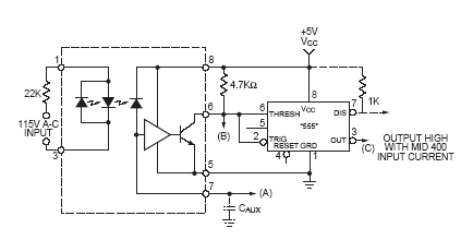 El circuito integrado MID400 de Fairchild (www.fairchild.com) consiste en un sistema ópticamente aislado para monitorear la tensión de la red de energía. Este circuito integrado consiste en un emisor infrarrojo con diodo invertido en paralelo, para accionamiento en corriente alterna además de un receptor de un circuito de disparo. El circuito detector consta de 3 etapas amplificadoras y un paso de salida con colector abierto. En la figura 1 tenemos un circuito de aplicación monoestable con la ayuda de un 555 que mantiene la salida en el nivel alto por un cierto tiempo cuando ocurre un corte en la entrada de energía para la red de 110 VAC. Observe que el circuito es alimentado por una tensión de 5 V teniendo pues salida compatible con lógica TTL y CMOS. Como el circuito integrado es un acoplador óptico también, existe un aislamiento total de la red de energía monitoreada. Observamos que el circuito integrado utilizado sólo responde a la falta de energía en el circuito de entrada.