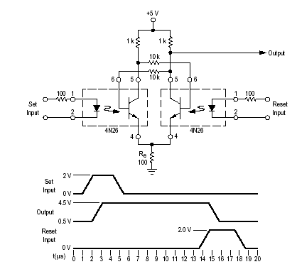 Motorola en su Application Note AN571A sugiere muchos circuitos utilizando acopladores ópticos como el 4N26. Uno de ellos, que encontramos muy interesante es el flip-flop mostrado en la figura. La principal característica de este circuito es justamente el aislamiento que obtenemos de la fuente de señal conductor, pues no existe contacto eléctrico entre el circuito de control y el flip-flop. Otra característica importante es su salida de 5 V, compatible con la tecnología TTL por lo tanto. Las formas de onda obtenidas en este circuito se muestran en la misma figura. Evidentemente, mostramos en el diagrama sólo una de las salidas, pero en el colector del primer acoplador podemos obtener una salida complementaria.