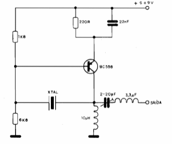Este circuito puede servir de base para pequeños transmisores, tanto usado en comunicadores como control remoto o transmisión de datos. El circuito operará en la frecuencia del cristal utilizado y el ajuste del mejor rendimiento se hace en el trimmer que casa la salida del oscilador con la entrada del paso siguiente. La alimentación puede ser hecha con tensiones de 5 a 9 V y transistores equivalentes pueden ser utilizados, incluyendo NPN con la inversión de la polaridad de la alimentación.