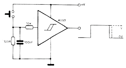 La finalidad de este circuito es evitar el repique (bounce) en circuitos con llaves o incluso sensores. Así, al presionar la llave se garantiza que en la salida se genere pulso único cuya duración depende básicamente del circuito RC de entrada. Una de las puertas del 4093 se utiliza como inversor. Para ello, las dos entradas se unen juntas.