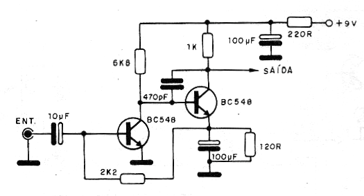 Este circuito ha sido diseñado para captar señales de llamada de un teléfono común a través de una bobina captadora. Estas señales se pueden aplicar a un amplificador para obtener escucha conjunta en un altavoz con buen volumen. El circuito debe ser alimentado por tensión de 9 V de batería o fuente. Los cables de entrada y salida de señal deben ser blindados.