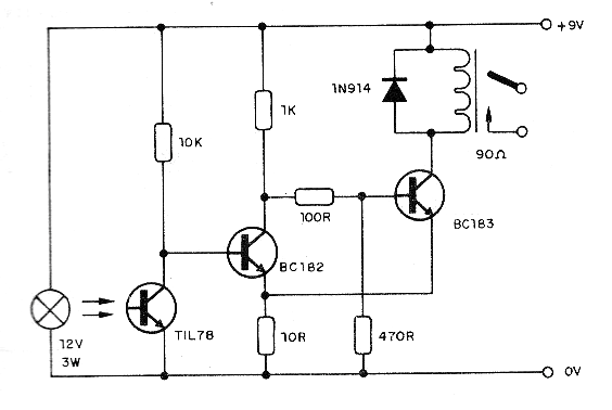Este circuito de acoplamiento óptico tiene en su configuración un disparador Schmitt. La salida acciona directamente un relé. La lámpara puede ser sustituida por otra fuente de luz capaz de accionar el circuito. Los transistores pueden ser sustituidos por equivalentes más modernos como los BC548 o 2N2222.