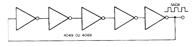 Este circuito puede generar señales de hasta 20 MHz, dependiendo de la tensión de alimentación. El circuito se basa en el tiempo que la señal lleva para atravesar los inversores, no necesitando componentes externos. Vea que se debe utilizar el número impar de puertas para que el circuito oscile.