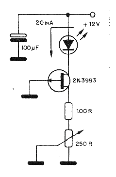 Este circuito es sugerido por Texas Instruments consistente en una fuente de corriente para excitar un LED. El transistor utilizado es un FET de canal P y la corriente ajustada hasta 20 mA en un trimpot de 250 ohms o 220 ohms. El circuito es alimentado por una tensión de 12 V. FETs equivalentes de canal P pueden ser utilizados.