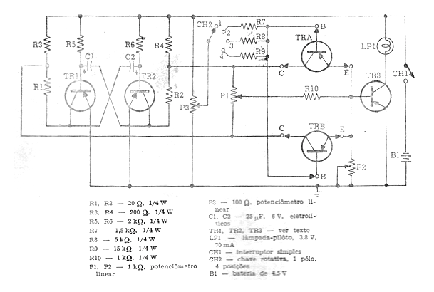 He encontrado este circuito en una revista de 1969, salva de inundación (de ahí el escaneado un tanto como borrado). Este circuito utiliza dos transistores en un multivibrador que genera señales para permitir la comparación de ganancia de dos transistores. Si la ganancia es igual a la lámpara LP1 indica esto cuando el potenciómetro P1 está centralizado. Con ello es posible seleccionar en un lote transistores con las mismas características. TR1 y TR2 pueden ser BC558 y la alimentación tanto se puede hacer con 4,5 como 6 V. Sugerimos sustituir la lámpara indicadora por un LED en serie con un resistor de 470 ohms.