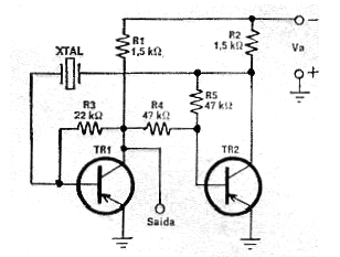 Me encontré este circuito en una revista francesa Radio Constructeur de 1968, salva de inundación (de ahí el escaneado un tanto como borrado). Este circuito utiliza dos transistores en un multivibrador controlado por cristal. Los transistores pueden ser los BC558 y la alimentación se realiza con una tensión de 6 V. El cristal puede tener frecuencias entre 50 kHz y 500 kHz. Los resistores pueden ser tocados por valores comerciales actuales, así como los capacitores. R5 funciona como control de intensidad de la señal generada.