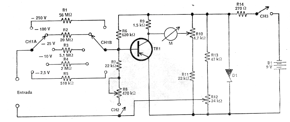 Me encontré este circuito en una revista francesa Radio Constructeur de 1968, salva de inundación (de ahí el escaneado un tanto como borrado). Este circuito utiliza un transistor para medir tensiones en 5 escalas con fondo a partir de 2,5 V y una sensibilidad de 200 k ohms por volt. El transistor puede ser cualquiera de uso general PNP como el BC558 y el zener es de 6, 3 V. El circuito cuenta con un ajuste de nulo y un ajuste de escala. El instrumento indicador es un microamperímetro de 100 uA de fondo de escala, pero se puede utilizar la escala de corrientes de un multímetro analógico común.
