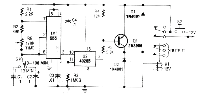 He encontrado este circuito en una Popular Electronics de junio de 1993, salva de inundación (de ahí el escaneado un tanto como borrado). Se trata de un circuito temporizador basado en un 555 y un 4020 (CMOS) accionando un relé al final del tiempo programado por el potenciómetro. El transistor puede ser sustituido por el BC558 y la alimentación se puede hacer con 6 o 12 V dependiendo del relé utilizado.