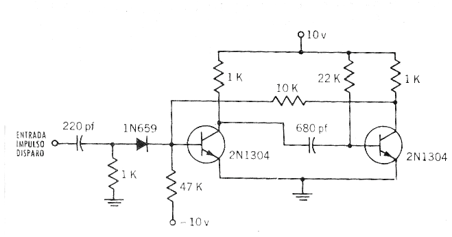 Este circuito fue encontrado en la revista Argentina Radio Chasis Televisíon de marzo de 1974. Esta revista ya no existe, pero existen muchos proyectos que pueden ser montados, bastando intercambiar algunos componentes por equivalentes más modernos. En este circuito los transistores pueden ser los 2N2222. El diodo puede ser el 1N4148 y la alimentación se realiza por una fuente simétrica de 10 V. La señal se retira del colector del segundo transistor.