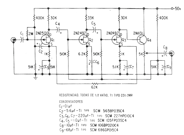 Este circuito fue encontrado en la revista Argentina Radio Chasis Televisíon de marzo de 1974. Esta revista ya no existe, pero existen muchos proyectos que pueden ser montados, bastando intercambiar algunos componentes por equivalentes más modernos. En este circuito tenemos cuatro etapas de amplificación con FET que pueden ser los BF245 y un paso con un transistor común que puede ser un tipo de baja corriente y por lo menos 80 V de tensión Vce. Observe la alta tensión de alimentación. La corriente consumida es muy baja.
