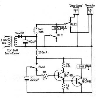 El interesante circuito presentado fue encontrado en una revista que ya no existe. Se trata de una Practical Wireless de noviembre de 1978. El circuito es viable bastando con utilizar los BC548 en lugar de los transistores originales. Lo que el circuito hace es conmutar el sonido de dos timbres con un toque sonoro musical inicial y un toque más fuerte la segunda vez que el interruptor es presionado. El transformador tiene 12 V x 500 mA de segundo. El circuito está diseñado para funcionar con timbres de 12 V, pero puede ser modificado para conmutar los timbres alimentados por la red de energía.