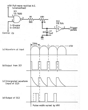 La interesante idea práctica presentada fue encontrada en una revista que ya no existe. Se trata de una Practical Wireless de mayo de 1980. En ella el autor del proyecto muestra cómo los circuitos lógicos TTL se pueden utilizar para producir los relojes para un Triac o SCR en un control de potencia. El circuito se sincroniza con la red de energía. En el original la red de energía es de 50 Hz, pero prácticamente no son necesarios cambios para operación en 60 Hz pues los ajustes en VR1 compensan las diferencias. R1 puede ser de 470 ohms que es el valor comercial más cercano a nuestros tiempos.